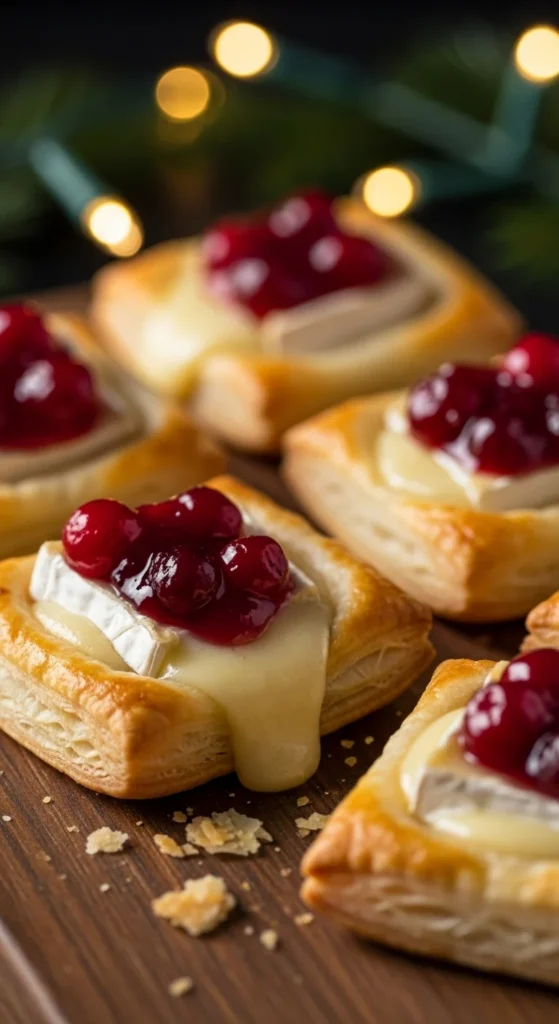 - Place a small piece of brie in the center of each square and top with cranberry sauce.
