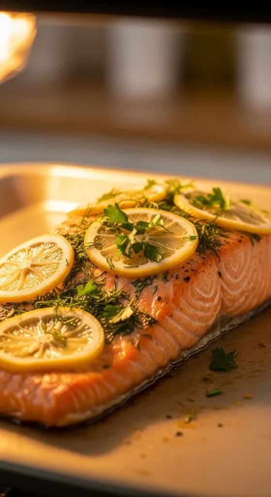 - Place salmon on a sheet pan and top with remaining ingredients.