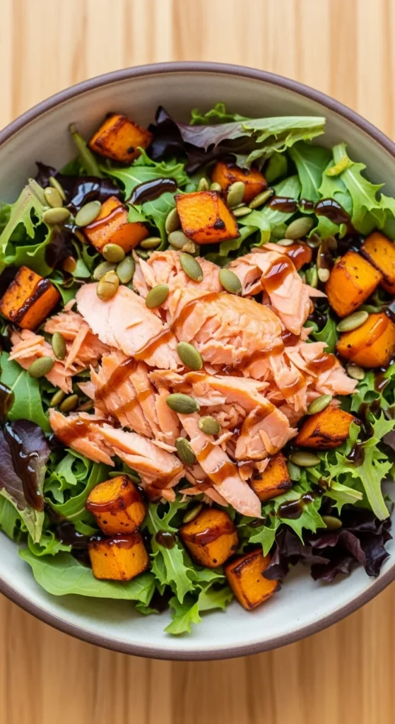 A salad bowl built around leftover maple-glazed salmon for a quick, balanced meal.