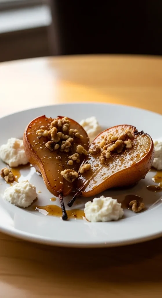 Elegant roasted pears finished with a maple-balsamic reduction and crunchy nuts — simple dessert or cheese course.