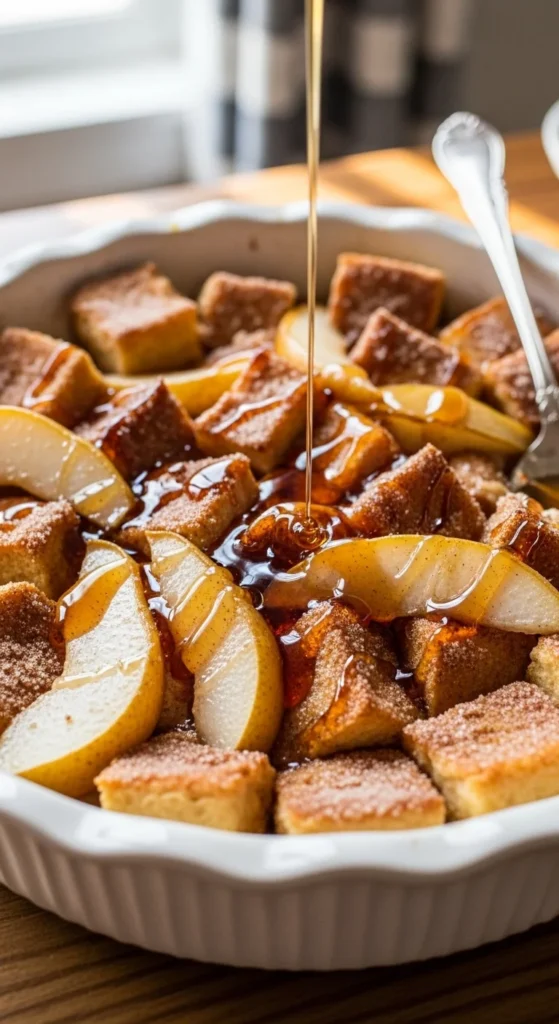 Top with caramelized pears, maple syrup, and a sprinkle of cinnamon sugar.