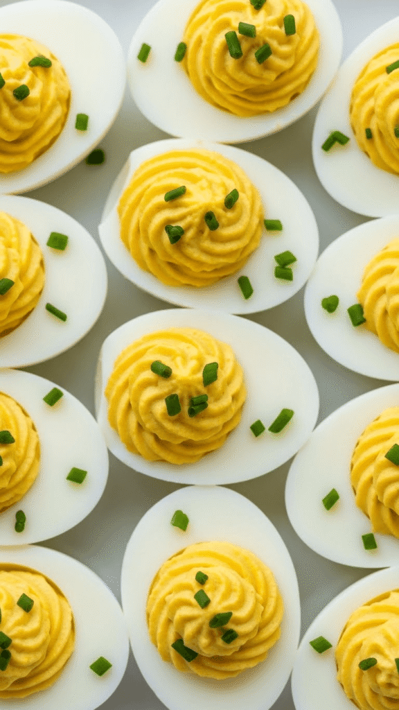 - Fill whites and top with chives.