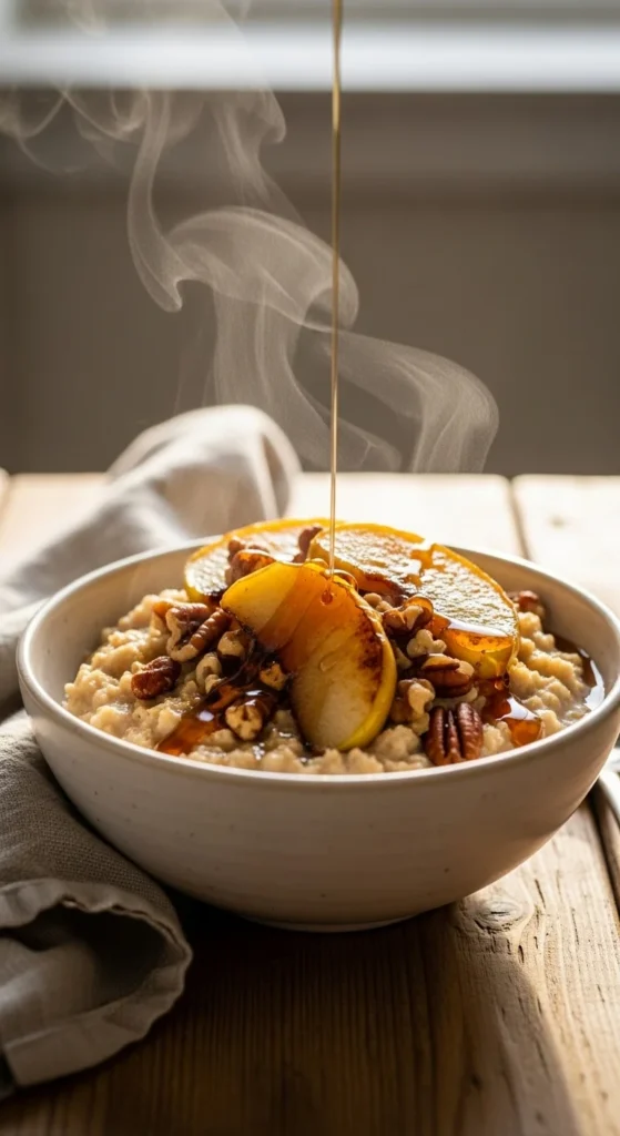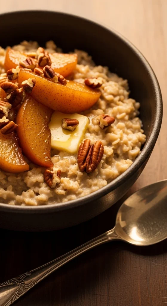 A cozy, slightly chewy oat bowl with caramelized apples and warming spices.