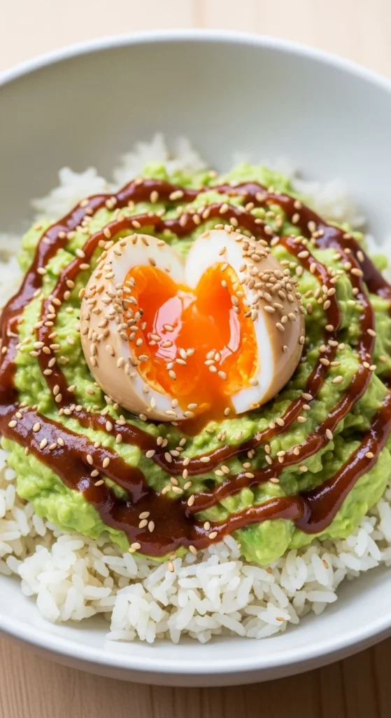 A versatile grain bowl topped with eggs and avocado for creamy texture.