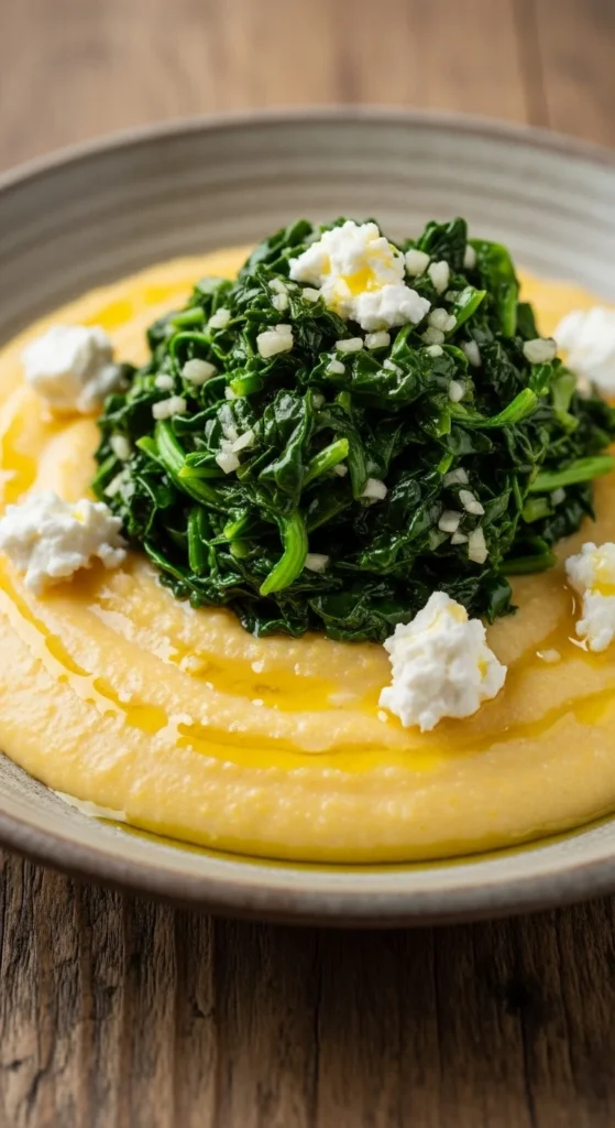 Creamy polenta topped with savory sausage and hearty kale.