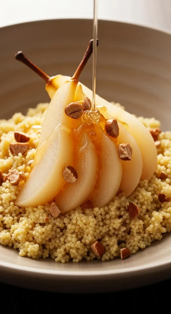 Light, gluten-free millet with sweet poached pears and honey.