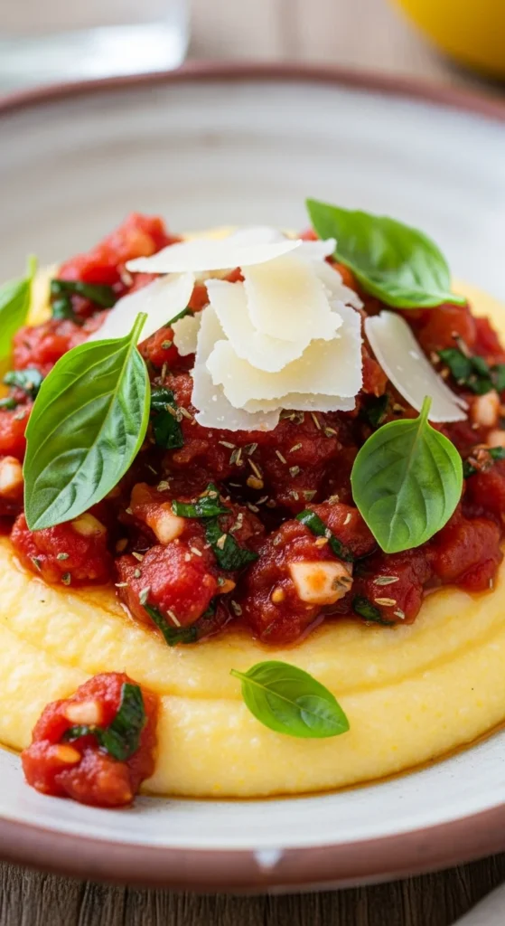 - Top polenta with tomato compote and shaved Parmesan.
