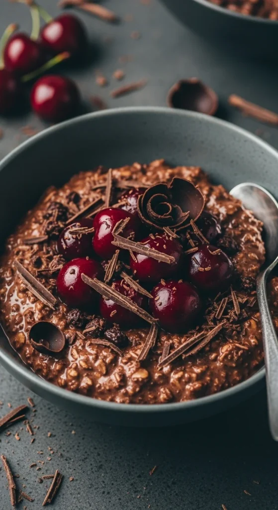 A dessert-like breakfast that still feels wholesome — oats with dark chocolate and cherries.