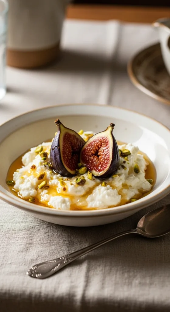 - Spoon warm ricotta into a bowl, top with figs and pistachios, drizzle extra honey.