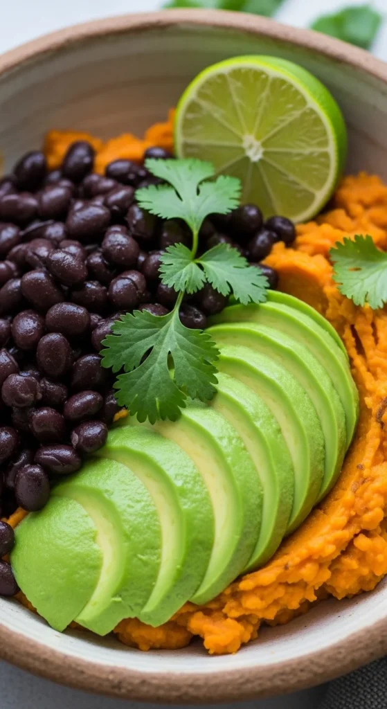- Mash baked sweet potato in a bowl, season with salt and pepper, top with beans and avocado. Squeeze lime over bowl and garnish with cilantro.