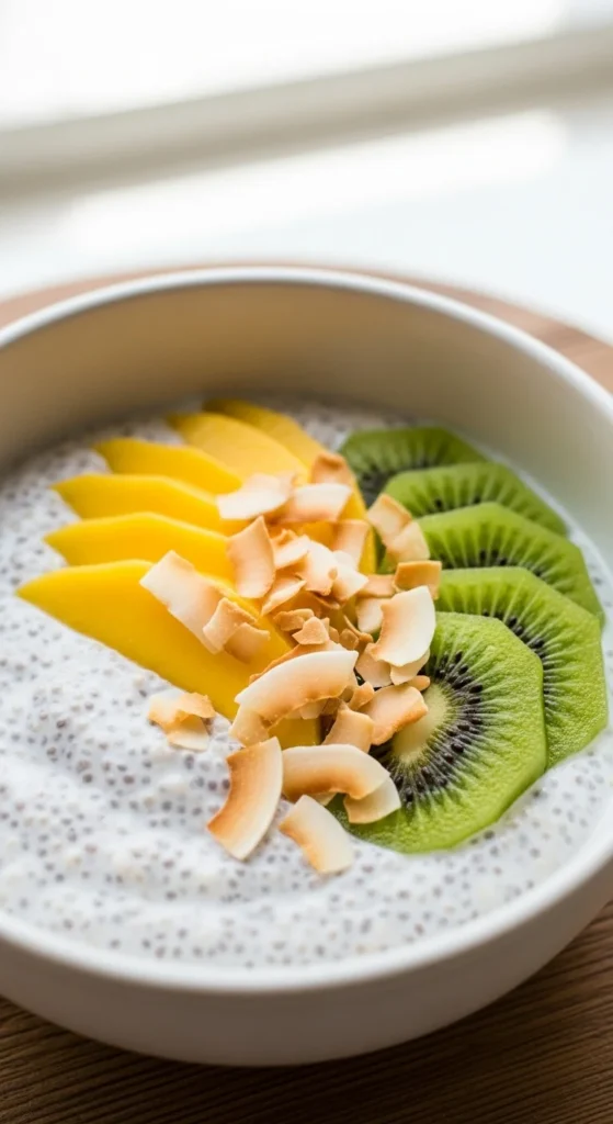 Silky chia porridge with coconut milk and tropical toppings.