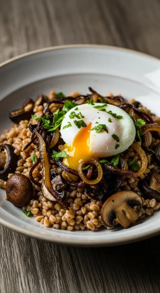 Nutty farro paired with umami mushrooms and a silky egg.